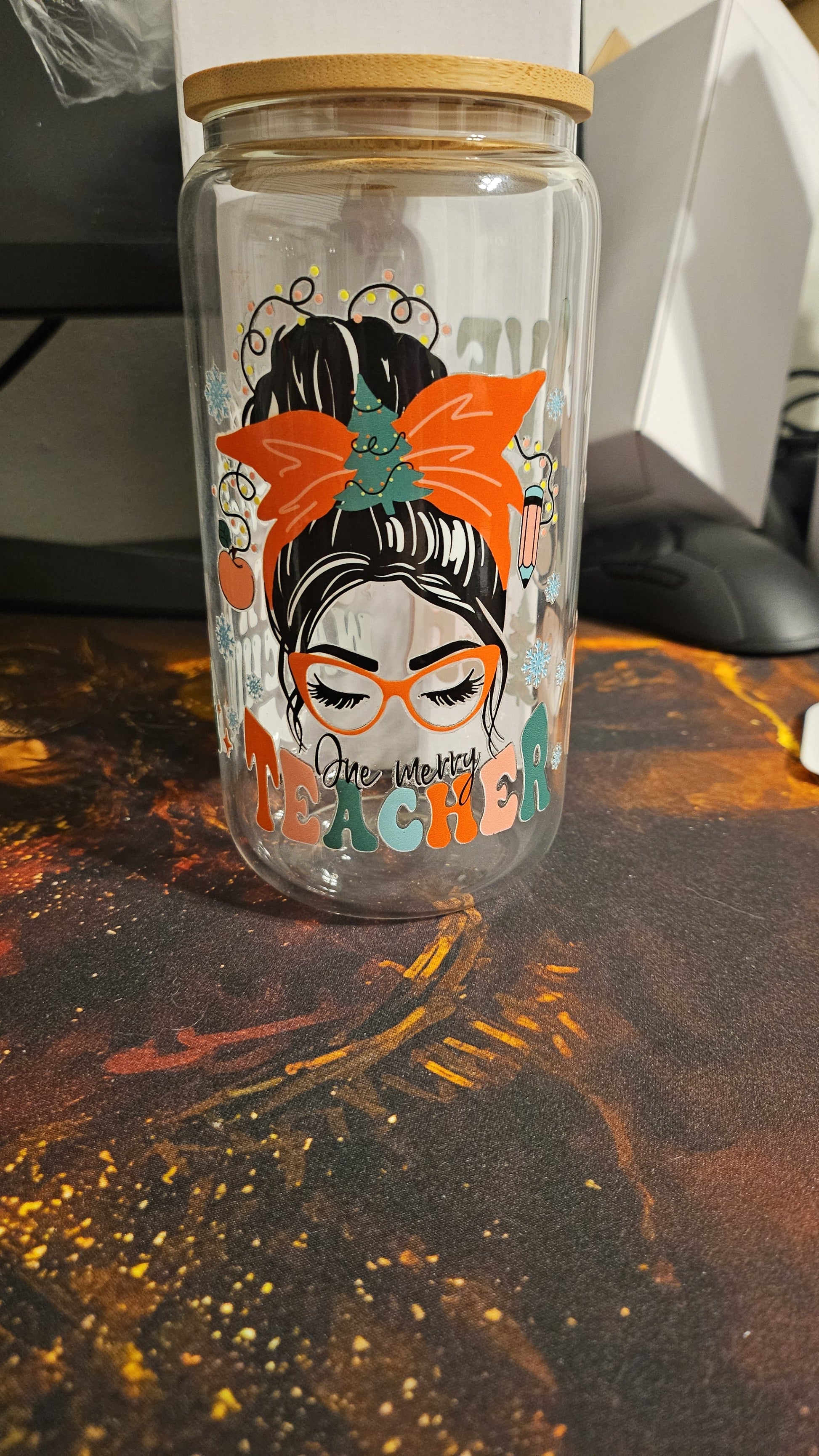 Overall, this glass tumbler is a great gift for teachers during the holiday season. It is a durable, reusable, and versatile tumbler that is perfect for carrying around in a bag or backpack. The Christmas-themed design on the tumbler is sure to bring a smile to any teacher's face and make them feel appreciated and valued.